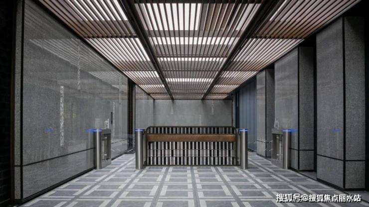 归家主廊道总长28米,采用高品质艺术花砖铺装,格栅景墙大面采用手工锤纹板镶嵌,提升调性。