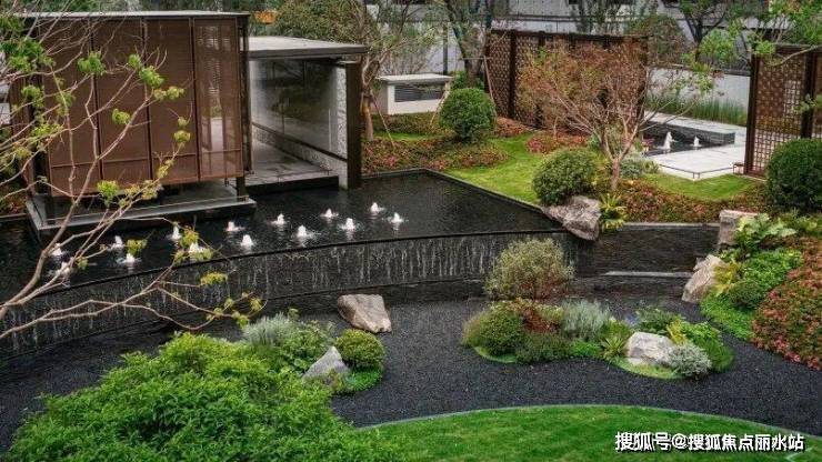 汲取宋代画作中的青绿精华,将其巧妙融入园林景观,打造温婉而高雅的青绿色调,营造“青绿之韵”的视觉主线。精选黑松、红枫等名贵植被,搭配蟒水纹铝板、蓝眼睛花岗石,辅以产自山西的黑山石作为点睛之笔,共同描绘出一个充满东方韵味、流传千年的美学画卷。