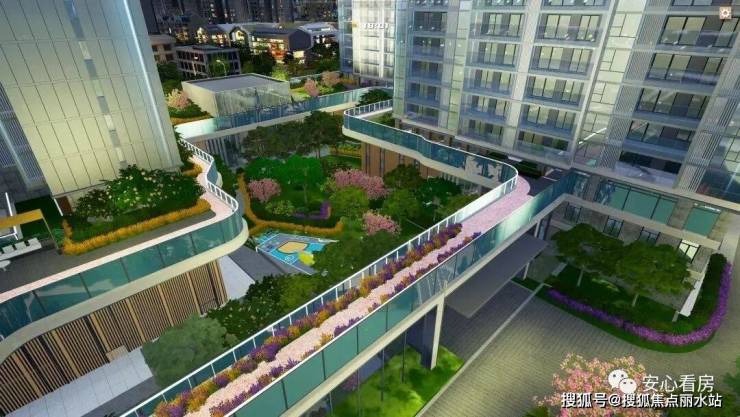 住宅裙楼建造新型园林空间——屋顶花园,将公园景致引入住区,以四季绿化,营造立体生态享受,兼具运动、社交、休憩多重功能。