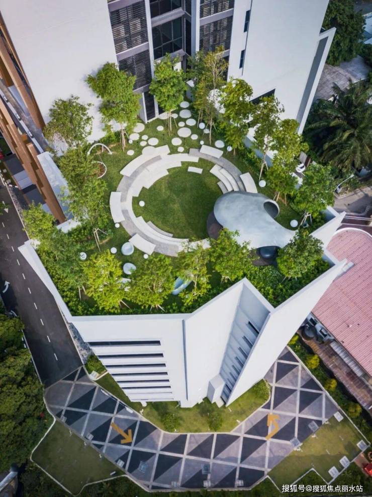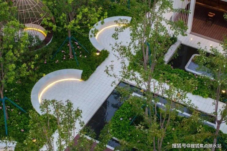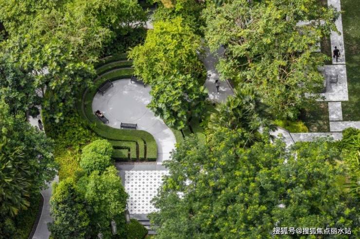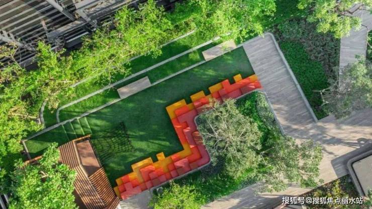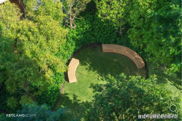 景观区域中央的休憩座椅适使用了下沉设计,周围被茂盛的绿色植物所环绕,为使用者营造了私密、惬意的绿色休憩空间。