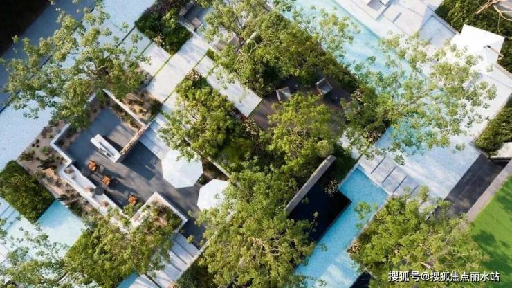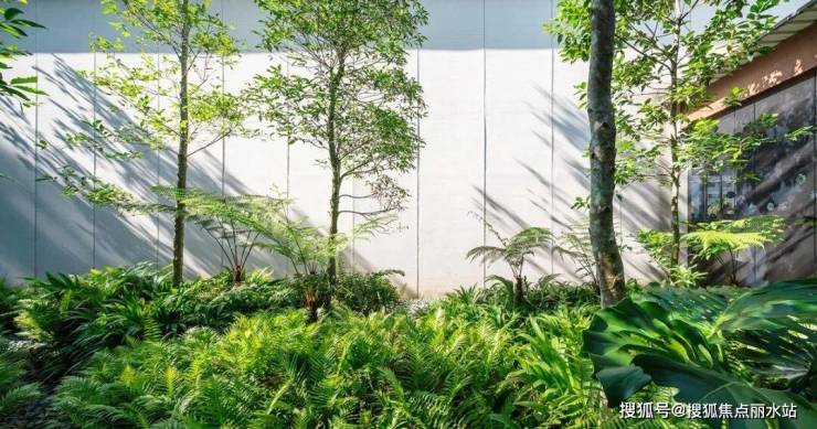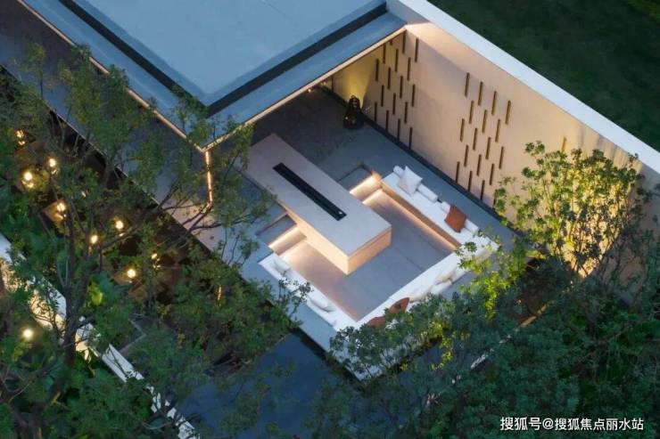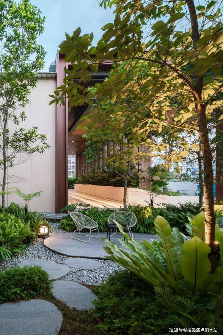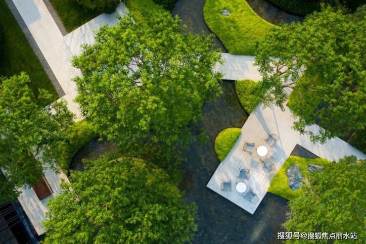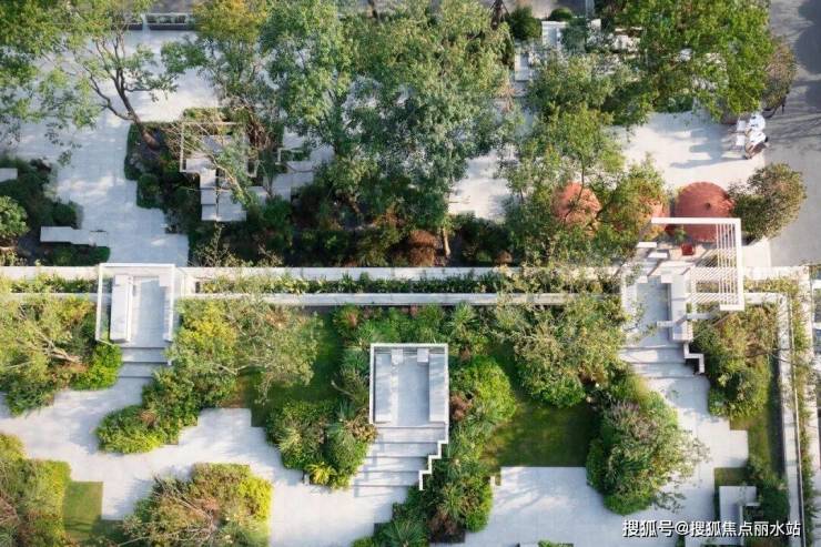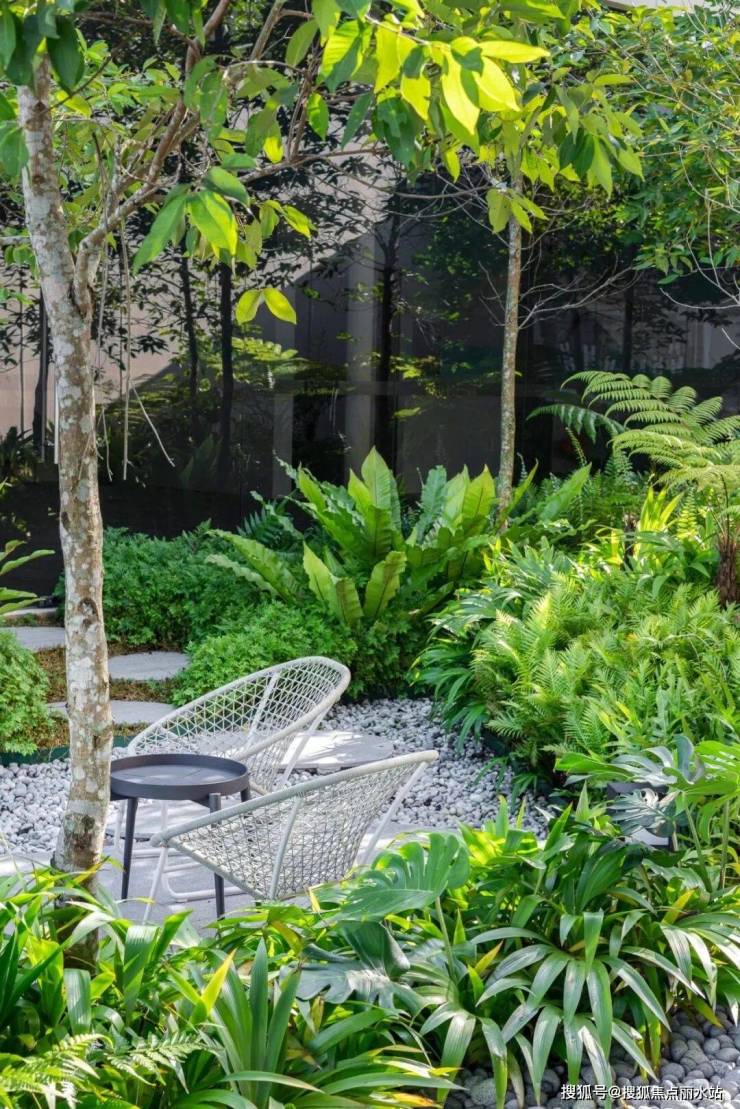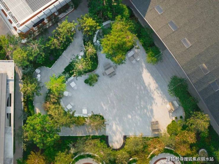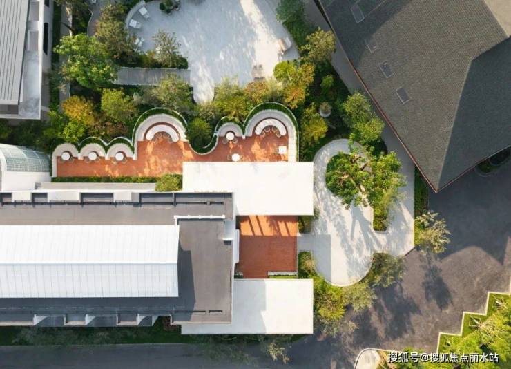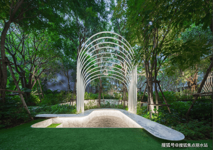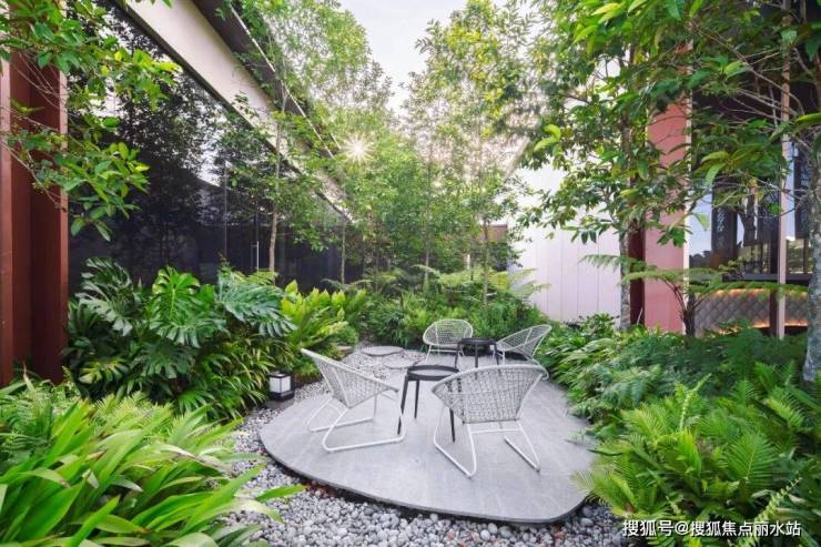 半开放的空间结构让室内外过渡自然,光影在绿植与建筑间流转,进一步增强了空间的灵动性与舒适感,整体打造出一处能让人们亲近自然、享受悠闲时光的精致景观场所。