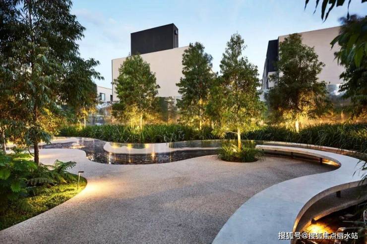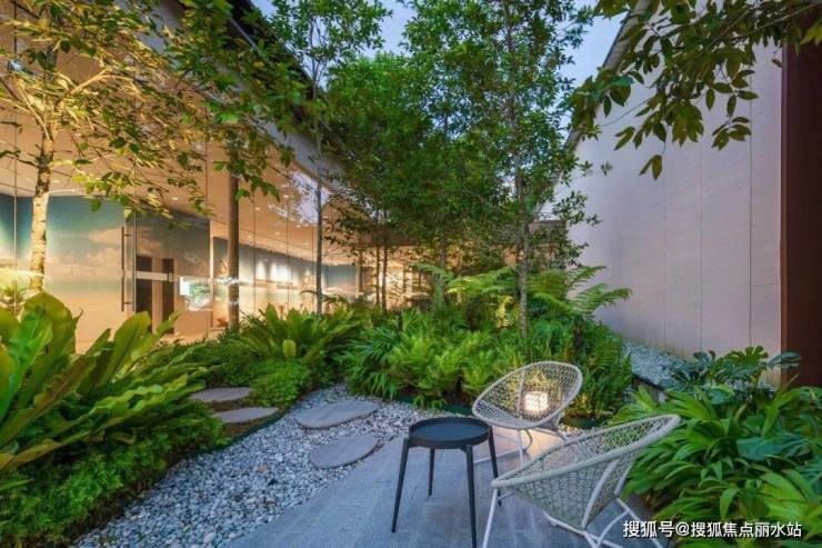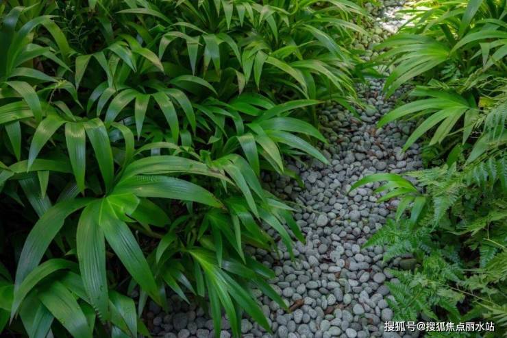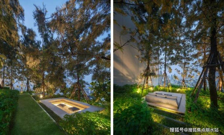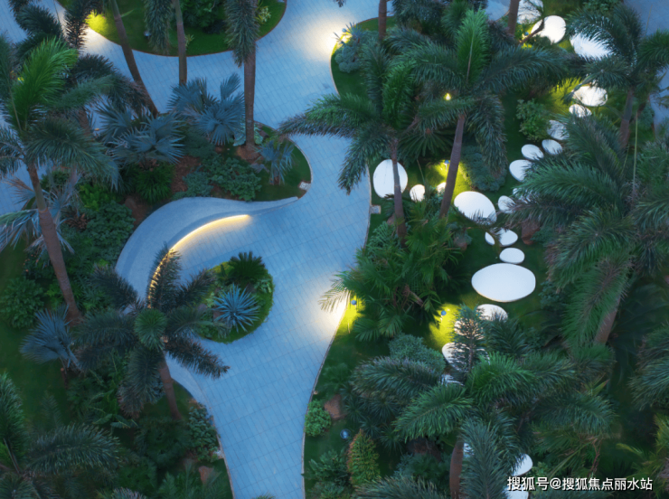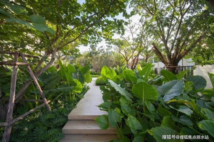 交通动线方面,入口路径采用自然石阶设计,搭配叠水景观,潺潺水声能营造更宁静、私密的氛围。软景设计上,整体采用热带风格,旨在打造郁郁葱葱的整体空间效果。