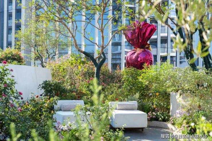 布置其间的休闲座椅,为到来的业主提供了小憩的机会。植物与艺术雕塑共同交织的自然清新又充满艺术氛围的休憩空间,仿佛都市中的一方静谧小天地。