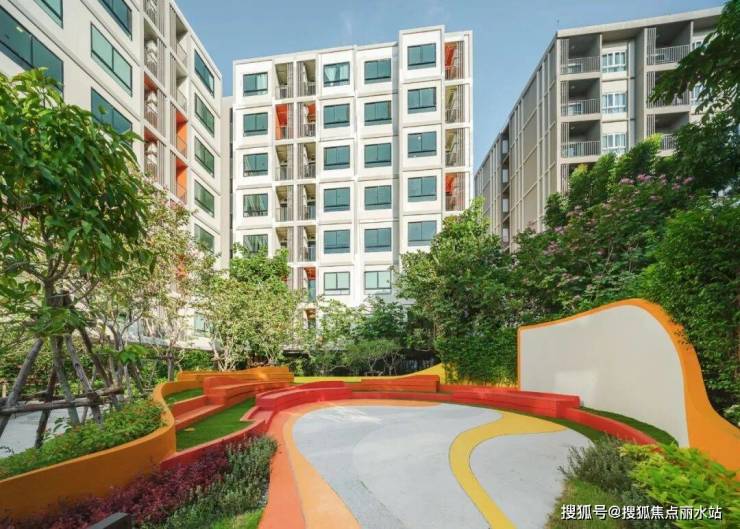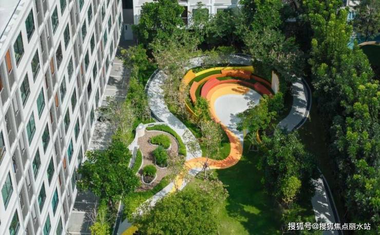 The lively Stream Valley Amphitheater 是位于泰国春武里府一处住宅公寓(Dcondo Vale Sriracha)里的休憩区域景观,由 Kernel Design 设计。这处色彩明快的休憩景观,是郁郁葱葱的社区景观中一抹靓丽的橙红。从高空俯瞰,整体造型灵动活泼,宛如自然舒展的曲线。