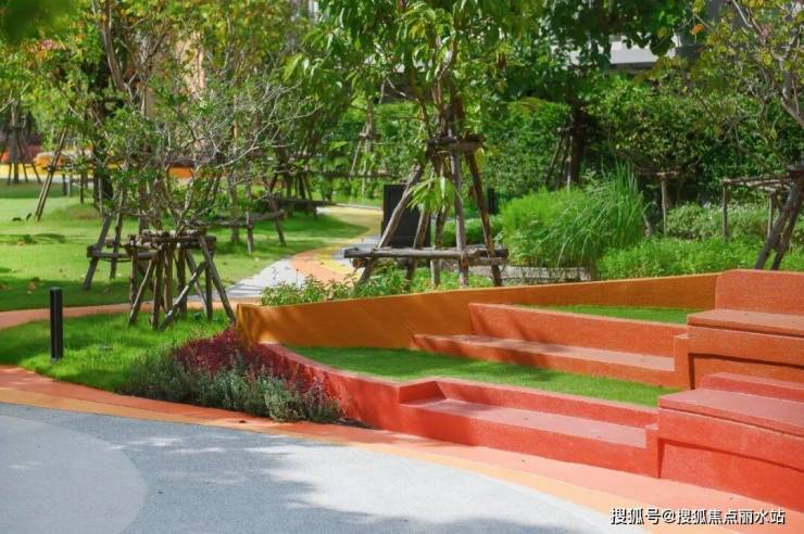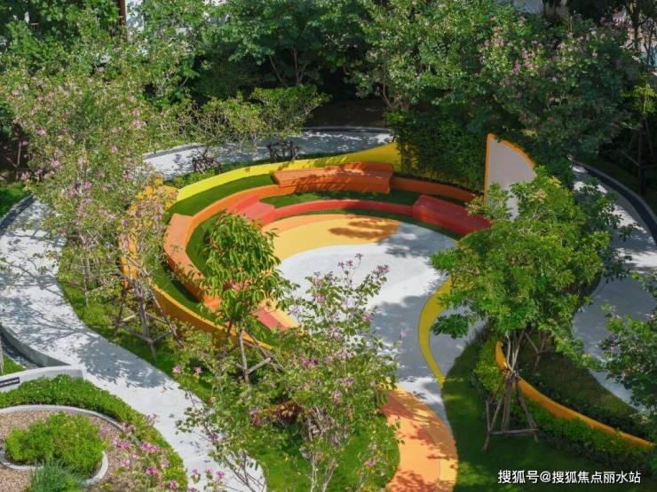 彩色的阶梯式坐凳环绕出一个核心活动区域,红、橙、黄等暖色调相互交织,与周围的绿色植被形成鲜明且和谐的色彩对比。蜿蜒的步道穿梭其中,将不同的小景观区域串联起来,步道旁种植着各类树木与花草,营造出自然惬意的氛围。