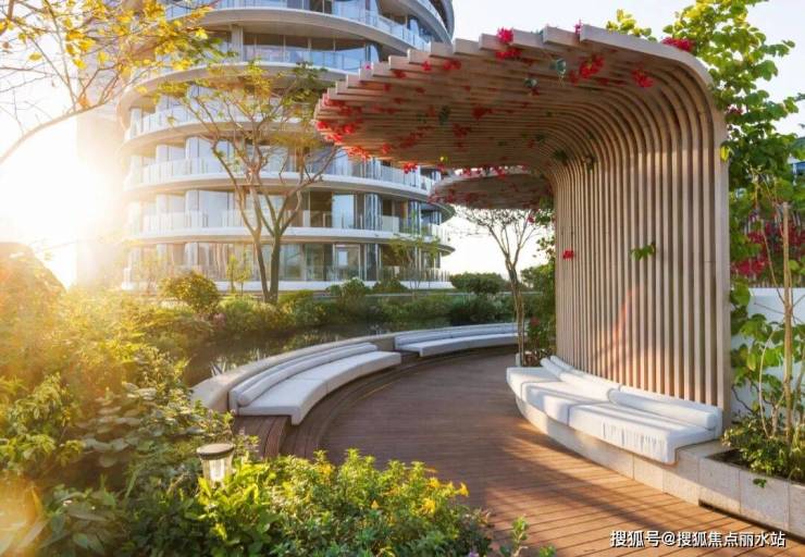 木质廊架缠绕着红花绿叶,弧形坐凳迎合了整体空间的造型布局,光影透过缝隙洒落,静谧水面倒映着周围绿植与建筑,营造出自然清新、舒适惬意的都市休憩空间。