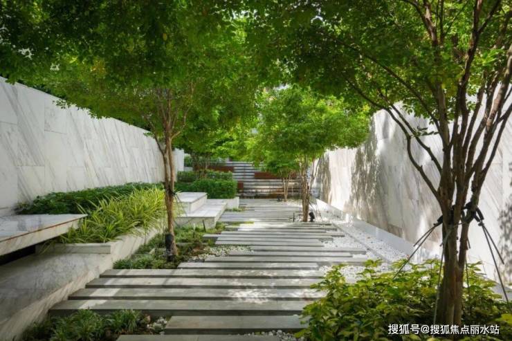 规整的石材台阶连接上下,两侧的石墙营造出简洁又雅致的围合感,其间错落种植的树木与各类绿植,为空间增添了生机与自然气息。