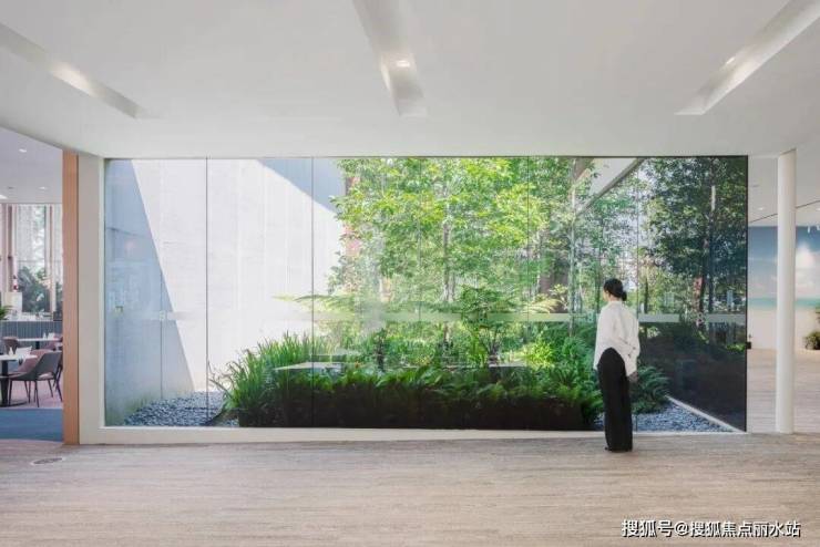 示范区内,大面积的透明玻璃打破了室内外界限,以丰富多样、高低错落的绿植营造出自然清新的氛围,既增强了空间通透感与开阔感,又借由色彩对比增添了景观细节与质感,让室内人员能沉浸式感受自然之美。