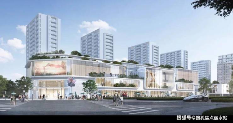 以方山下未来社区为起始,沿劳动南路主干道依序经过商业、幼儿园、未来社区服务场景,建筑风格由偏重未来感逐渐过渡到宋韵的小区主入口。