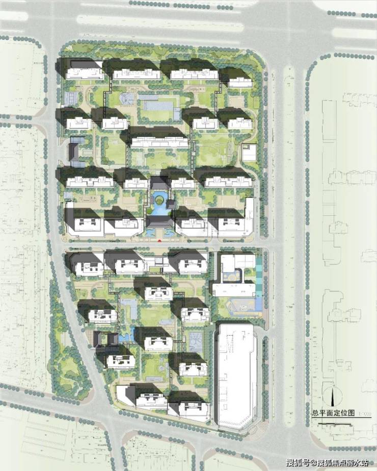 安置房次入口与商品房主入口相向而对,同样采用宋韵民居形式特色,而姿态更加含蓄;内部街道立面延续至入口处以片墙衔接,旨在营造近人尺度下空间体验的连续性。
