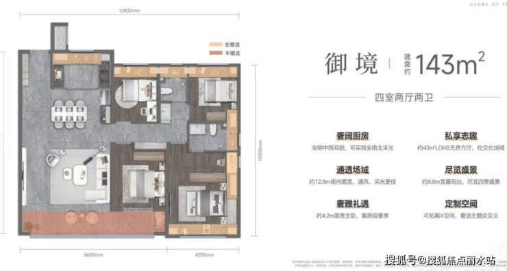 143 平户型四室两厅两卫,8.6 米宽南阳台,12.8 米南向宽通风,4.2 米面宽主卧,43 平无界方厅。