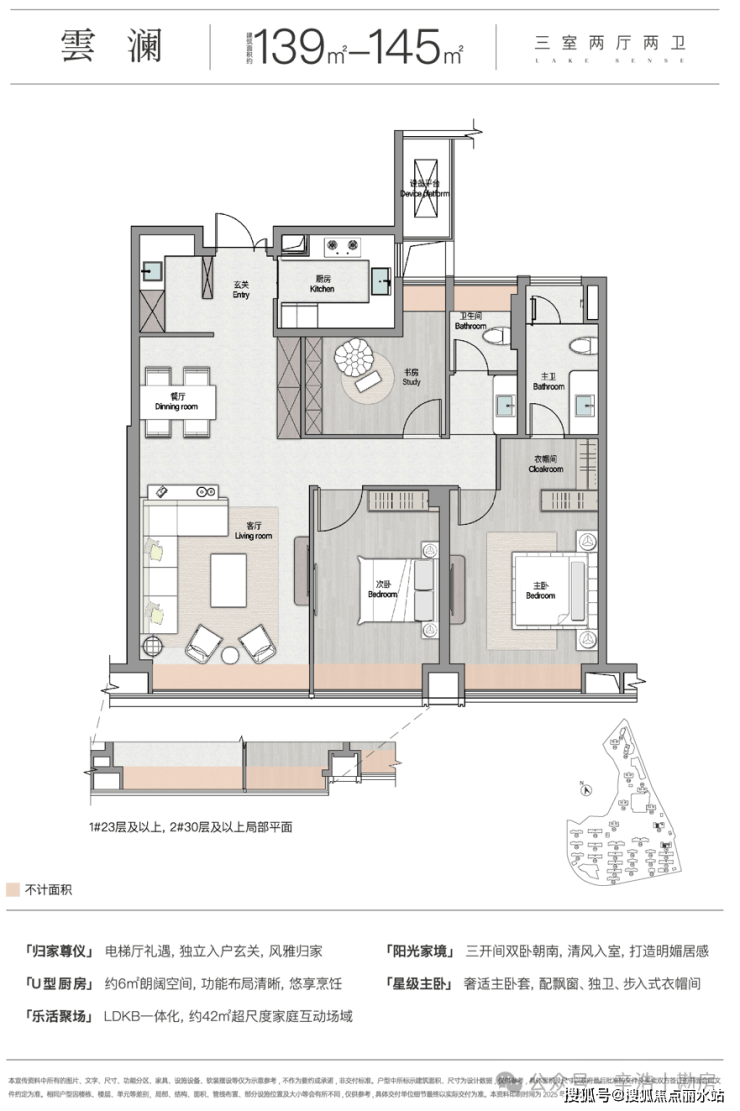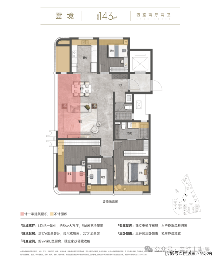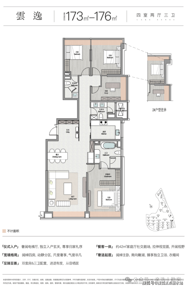 🔹准四代户型设计,实现约93%-103%超高得房率,营造“270度全景舱”、“双主卧奢阔套房”、“LDKB+X无界空间”、“三开间阔绰尺度”等,呈献湖滨美学作品。