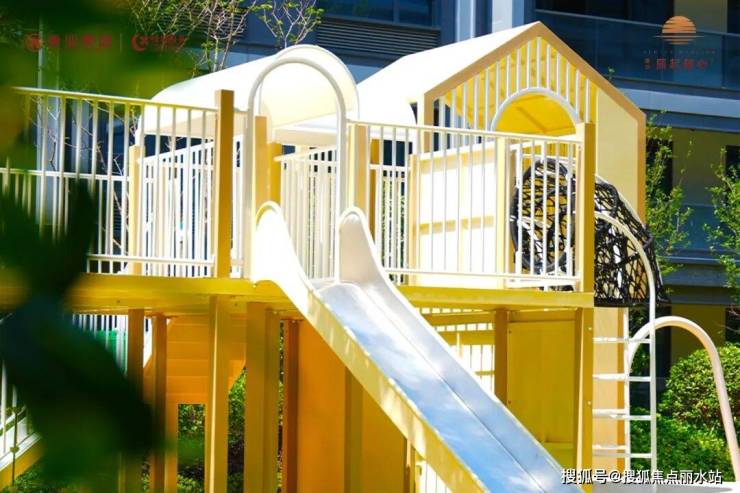 儿童乐园里,以马卡龙色系的彩色设施,搭配顶棚、护栏等安全防护,守护小业主斑斓多彩的童年时光。