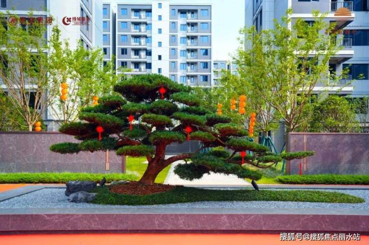 北大门处,罗汉松与朴树阵列形成迎宾仪仗,枝叶舒展间传递着"松鹤延年,家业长青"的美好祝福。