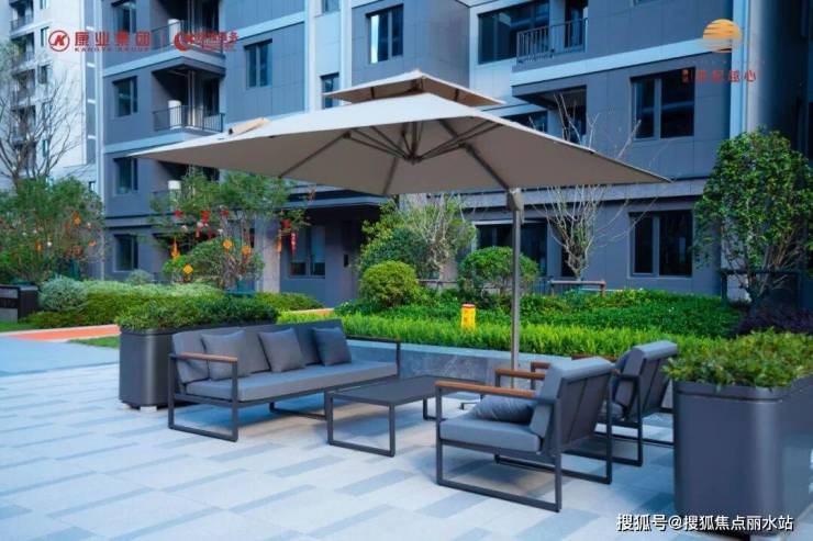 亭亭如盖的绿荫之间,柔软舒适的休闲座椅可及时风干,搭配遮阳伞,让业主随时可在园中小憩闲谈。