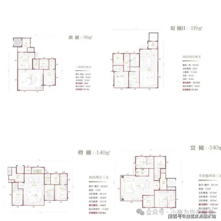 7号楼小高层为两梯两户布局,2个单元,主打140平米四房三卫(全景舱+方厅设计),与一期产品一样,区别在于二期7号楼另有8套城市平墅,算是一个新品;