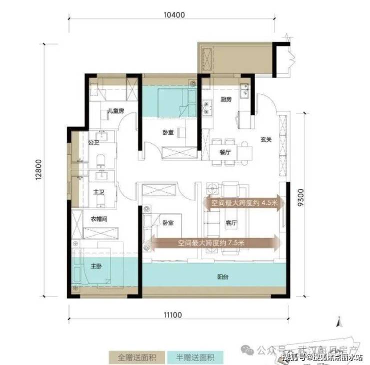 整体布局与100平户型大体一致,可以看做100平户型的放大版,但得房率更高,可达约100%,内部空间尺度更加舒适。