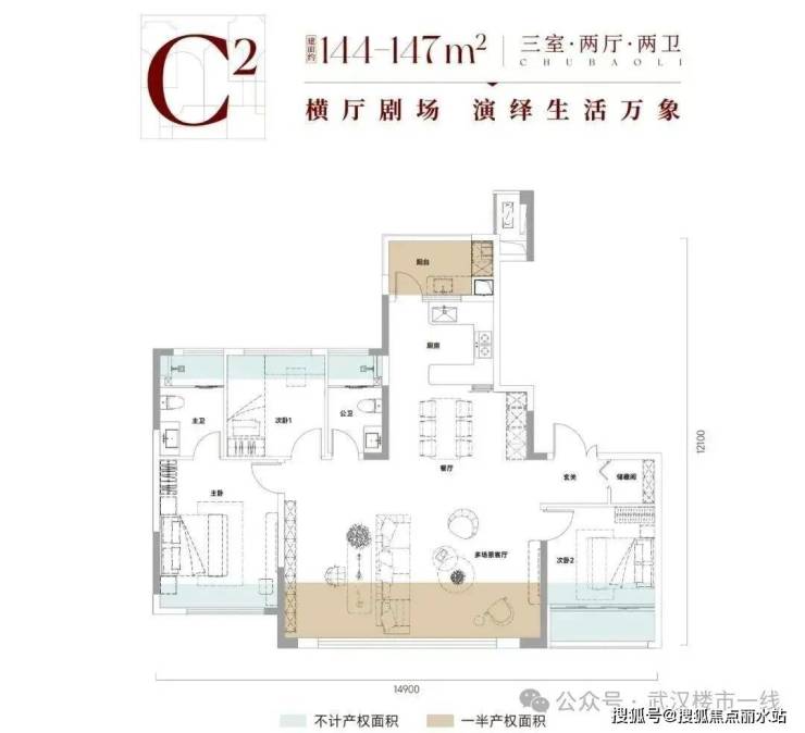 建面约147平三房两卫,每个房间都足够大,适合想要大平层的人群,如果需要4个房间,从客厅改出一间书房也是非常nice的。