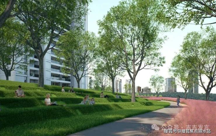 代建约2.8万方城市山丘公园:为社区健康底盘,以悬浮澍树、粉黛草原、山丘慢跑道及林下剧场等场景,为业主缔造城市山屿式慢游日常