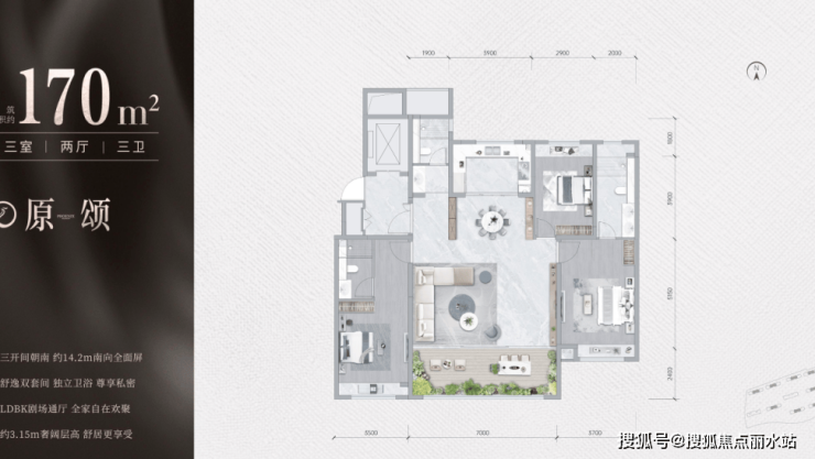 ①超级入户大门。项目西门打造近130米宽的正面景观界面、约8.8米高的形象大门,对标华润瑞府,打造地上地下双入户大堂,地上做了约6米挑高大堂。