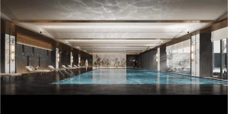 ②约2000㎡的山水立体会所。配备恒温泳池、健身房、瑜伽室、行政酒廊、茶室、会客厅、私宴厅、多功能包房等配套。地库设计也是别具一格,4米层高的全明光合地库在徐州也是少见。