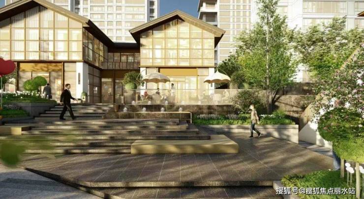 ④宋风商业街区。项目融合宋式美学,利用场地高差,打造融合传统意境的现代商业街区。建筑外立面采用铝板、大理石与玻璃幕墙的复合材质,风格类似成都太古里的新中式风格。
