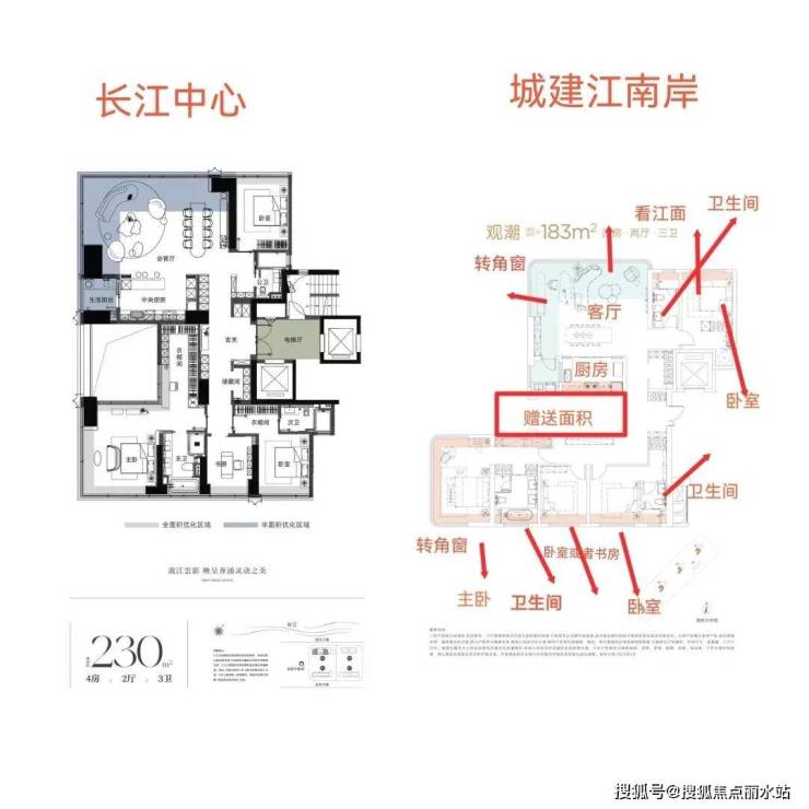 🌅 全景舱户型:全系标配 Low-E 全景落地幕墙,7.4-9 米瞰江横厅,视野开阔;184㎡主卧三面环幕设计,将长江美景尽收眼底;圆弧转角玻璃消除结构柱,让视野更加通透。