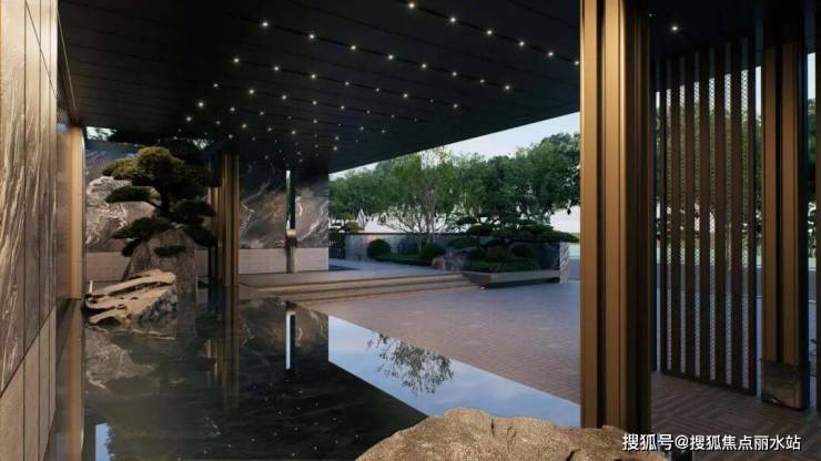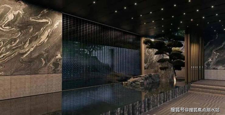 而门口的墙面,更是用大理石与绿植山石装裱出一幅立体的山水画,在垂直立面上演绎“石中有画,画中有境”的宋式空间美学。为了契合宋代织锦的“天华纹”,泳池对景墙独创了“琉璃錾铜·经纬叠映”的构造,以铜为骨,内嵌玻璃砖墙,用琉璃构建出特殊的“经纬提花”.