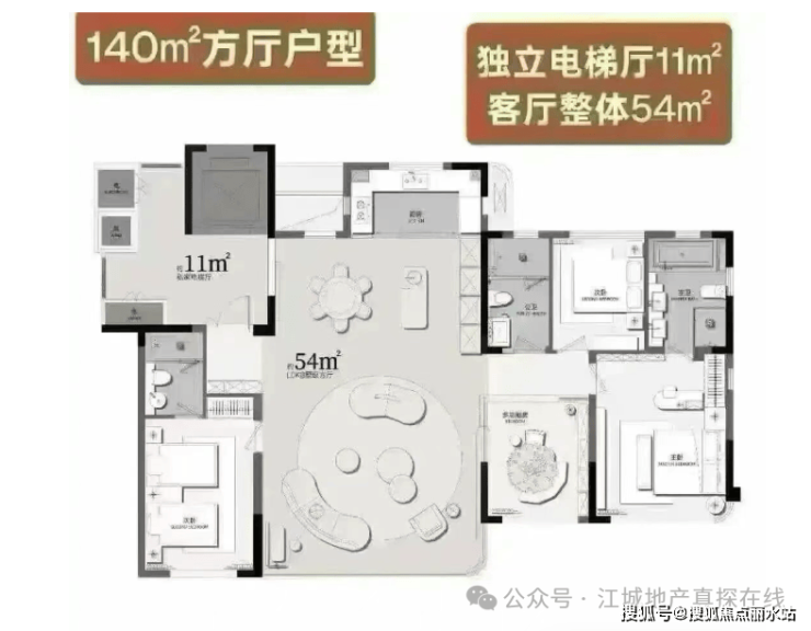 其中建面约140平的方厅户型实现了双套房+超级方厅,让你改善置业就能达到越级的豪宅体验。