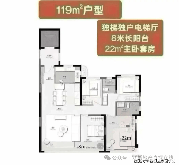 建面约119平的边套则做成标准四房+大横厅,足以秒杀周边建面约140平传统户型。