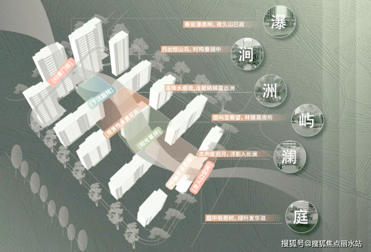 此外,该设计在空间布局上独具匠心,采用了洄游式景观设计理念,让游客可以深入其中,亲身体验不同景致的变换。这不仅是对宁波传统山水庭院的一种创新,更是实现情景交融的一次成功尝试。特别值得一提的是,绿城还精心打造了一条蜿蜒的小径,它穿越林间,一路延伸至景观叠水,再曲折而上,绕过崖壁,最终通向二楼的宽敞景观台。这条小径不仅是一条通向美景的路径,更是一条引领心灵回归自然的旅程。