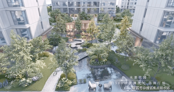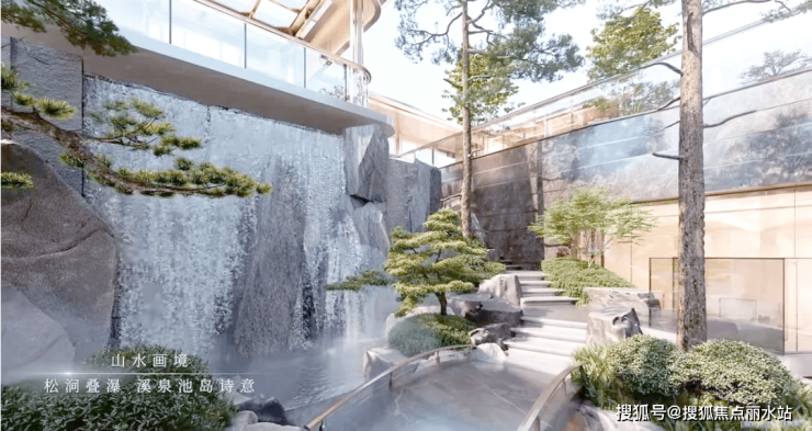 绿城·馥香园的山水庭院设计,巧妙融合了山、水、石、树等元素,呈现出一种独特的视觉美感,仿佛将人们带入了一幅生动的青绿山水画卷之中。其中,流水跌瀑的设计尤为引人注目,老皮石模拟的天然崖壁与山石错落叠放,水瀑落下时飞珠溅起,营造出一种“断山疑画障,悬溜泻鸣琴”的诗意氛围。