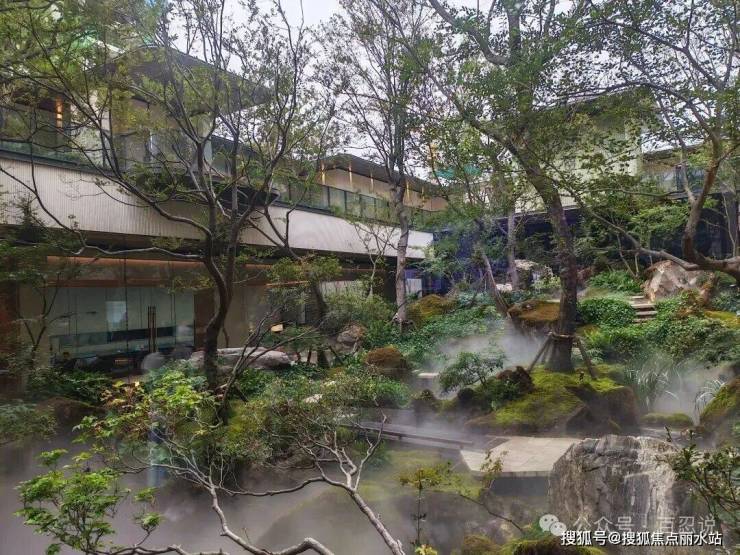 多维立体的巨大石材之间,6米高的悬壁飞瀑,水势很大,潺潺流水,层层跌落,几十年生的三棵乌桕树形成绿化支撑,中间道路穿梭期间,还有花草点缀。徜徉期间,舒适惬意。还有两棵海棠树,形成棠系的点睛之笔。