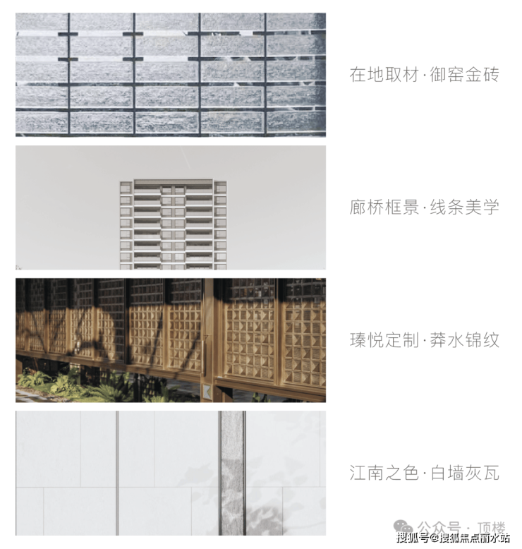 保利姑苏瑧悦取法苏州园林的廊桥框景线条美学,演绎为框体线条造型和简洁舒展的立面肌理。在地取材,运用质朴拙雅的御窑金砖,提取粉墙黛瓦的江南之色,定制兼具东方韵味和现代质感的蟒水纹,呈现与众不同的东方韵律和建筑表情,让家成为城市中一眼的确定。