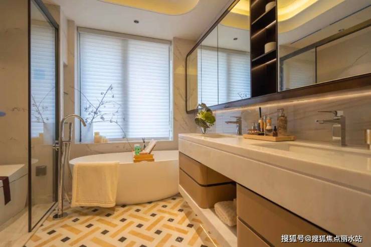 博世五件套、其中冰箱是博世8系最高顶配,全嵌入式、全进口的。还有方太万元侧吸油烟机,爆炒辣椒也不用担心跑烟。空调、厨余处理器、净水器等,也都包在交付标准内;卫生间:镜柜配置美妆冰箱,守护主人高端的护肤美容产品;