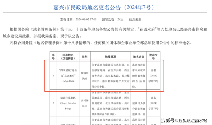 上周,在嘉兴民政局官网上发布了嘉兴市民政局地名更名公告(2024年7号),其中由嘉兴鹏源房地产开发有限公司申报 的“四季星城”更名为“花语禾府”。