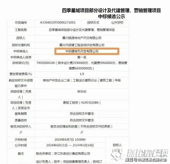 之前已公示,中铁建城市开发有限公司中标了四季星城项目部分设计及代建管理、营销管理项目,中标合同额7905万元。说四季星城项目的代建代销将由铁建城发接手。