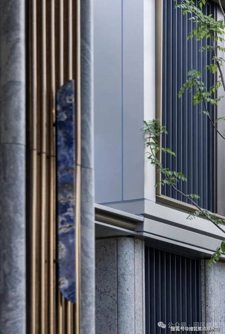 美学之外,匠心于内。蜂窝铝板与印度白玫瑰石材干挂立面,从建筑外部一体延伸至架空层内部,柔和了空间的边界,重点部位则以石材拉槽精准搭配金属线条。以美学的一体化设计,在光影流转间,营造出极具仪式感与尊贵感的归家序厅。
