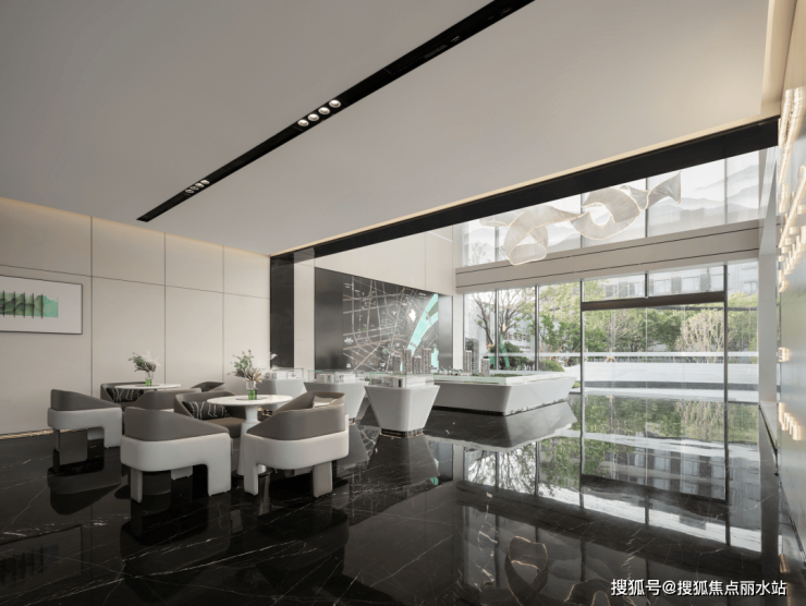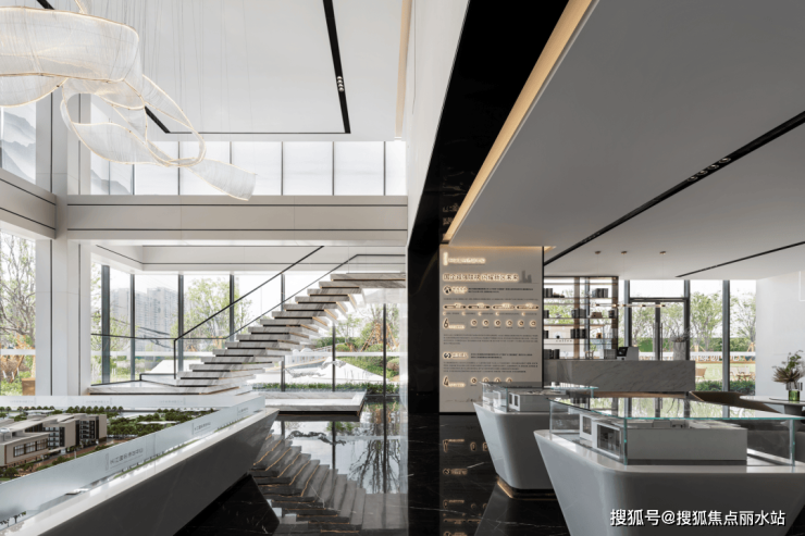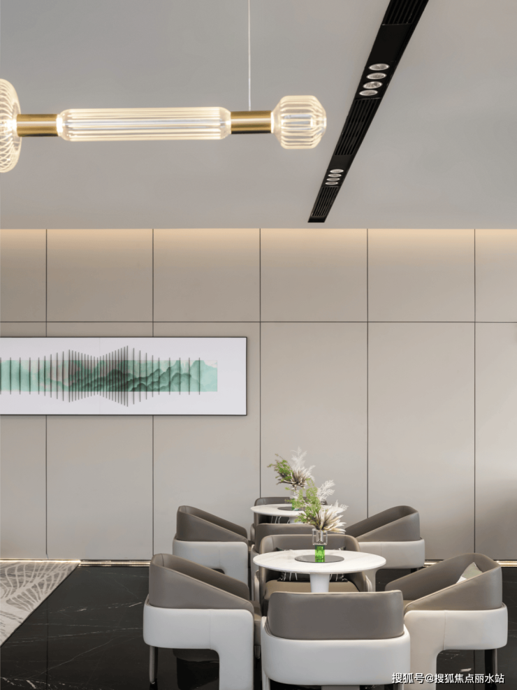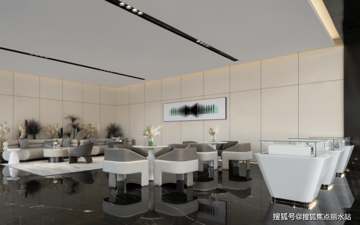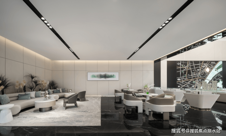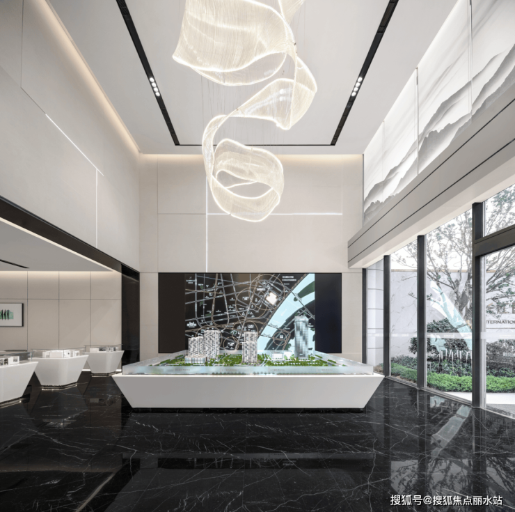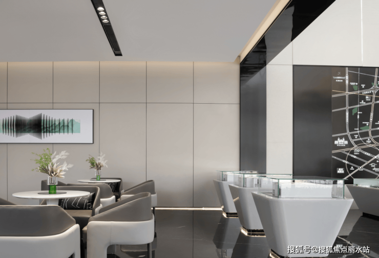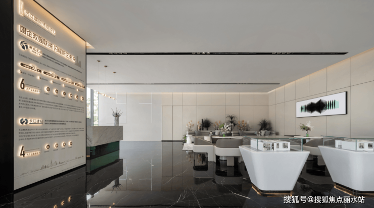 在保留功能性的同时创造舒适敞亮时尚的体验空间。营销大厅墙面新型材料镜云石的运用在保留石材原有的质感,空间时尚简约。运用叠级错拼手法,使单一的材料突显活力。