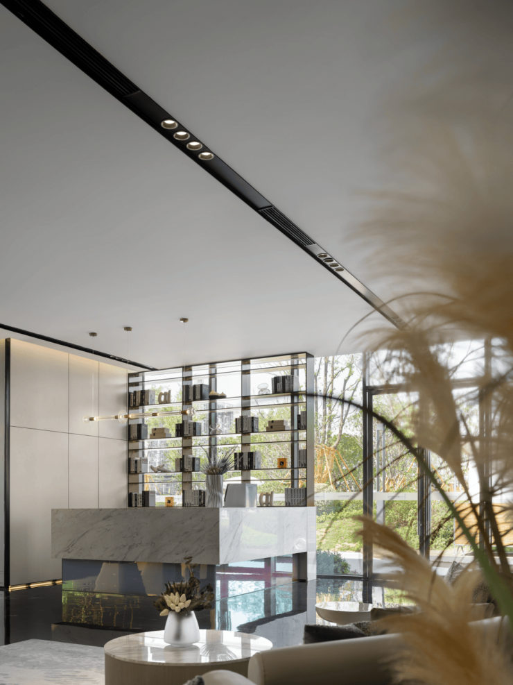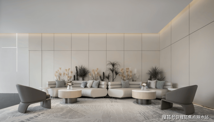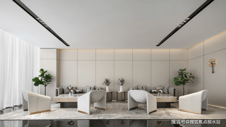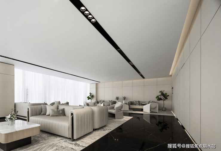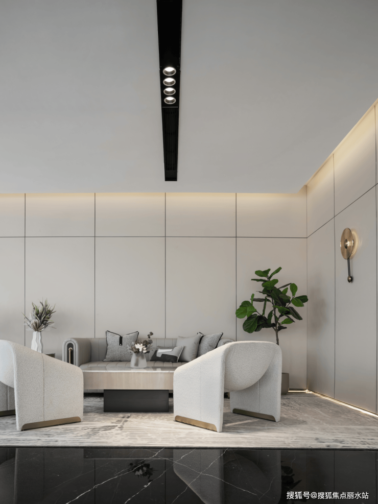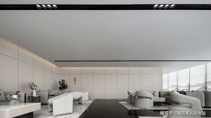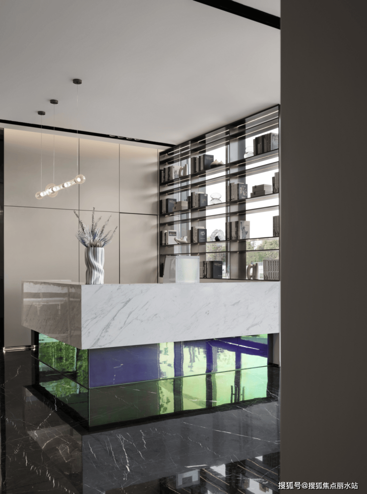 在保留功能性的同时创造舒适敞亮时尚的体验空间。营销大厅墙面新型材料镜云石的运用在保留石材原有的质感,空间时尚简约。运用叠级错拼手法,使单一的材料突显活力。