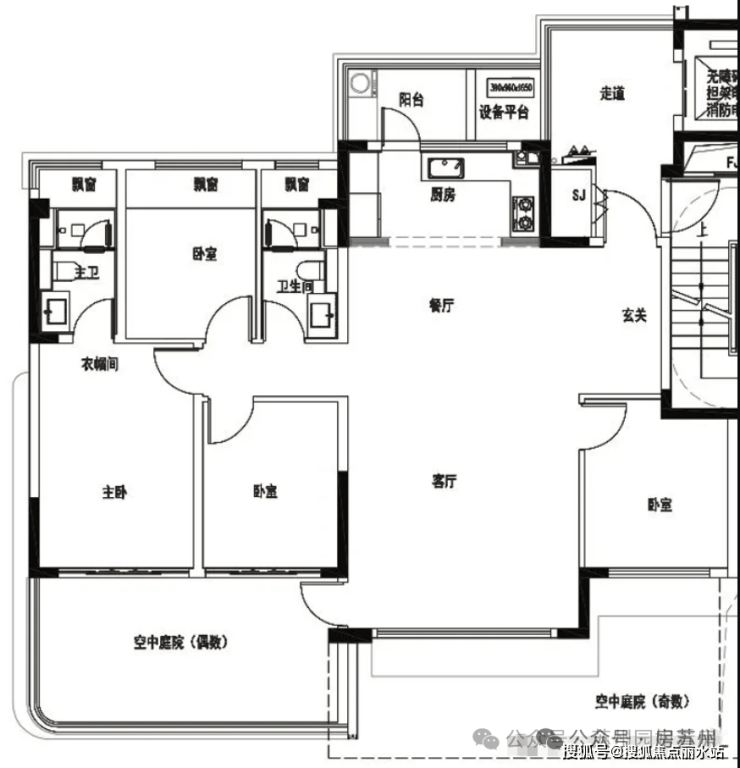 整体南向开间约14.5米,客厅开间约5m,主卧套房,北向生活阳台,分奇、偶数层,区别主要在于空中庭院,整个户型综合使用率超100%!