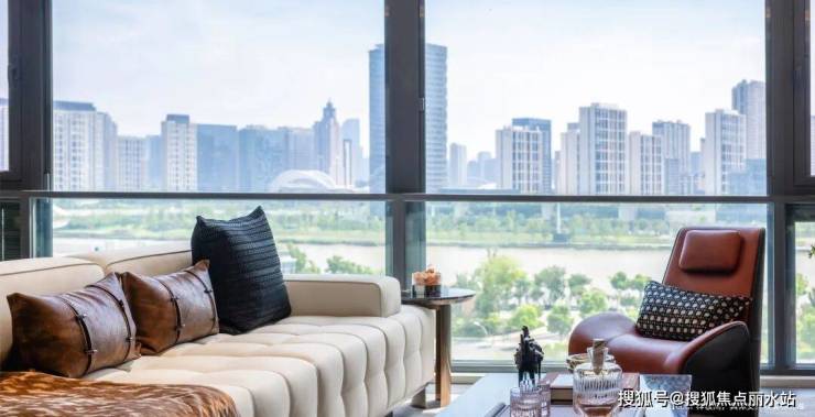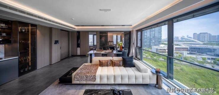 中海·江湾樾重构宁波主城天际审美,其外立面遵循公建化立面,以视觉的整体性赋予建筑低调且奢华的气质。超高窗墙比,优化室内采光度和通透感。高级的浅灰色调搭配香槟色的金属铝板,立体挺拔的建筑与湾岸线正映衬。