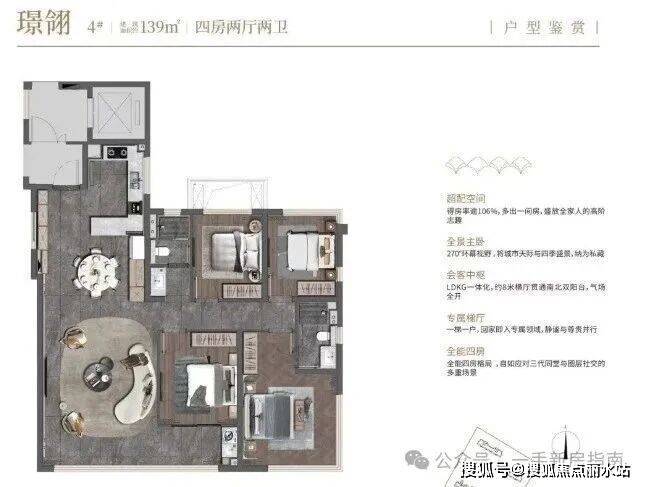 建面约139平四房就是三代同堂的优选了。全能四房格局,优化后约106%的得房率,室内空间超越一些建面约160平以上的豪宅。