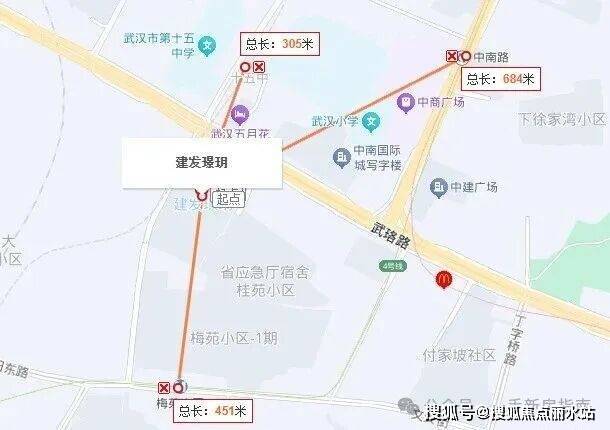 建发璟玥南侧约400米是4号线梅苑小区站,北侧一路之隔便是在建的12号线十五中站,到2号线中南路站直线距离也仅约600多米,出门就有三地铁,占据武昌核心交通枢纽。