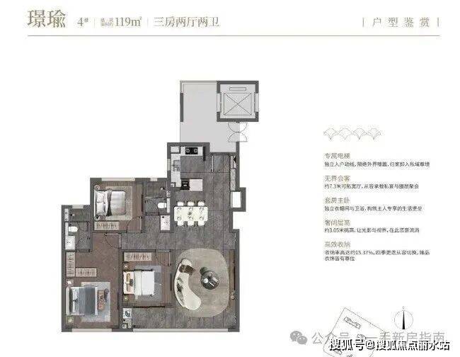 户户带有独立电梯前厅,综合得房率超100%,全面实现负公摊。