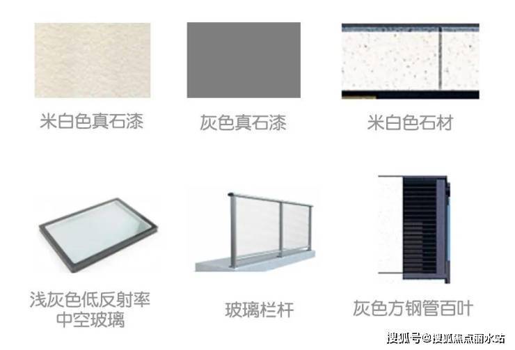 整体建筑遵循简约的设计理念,强调横向线条,轻巧优雅。立面材质以米白色真石漆、石材为主调,辅以灰色装饰点缀,形成视觉焦点。玻璃在光线的作用下,显现出不同的光影变化,亦实亦虚,美仑美奂。