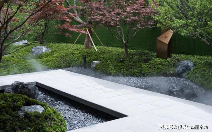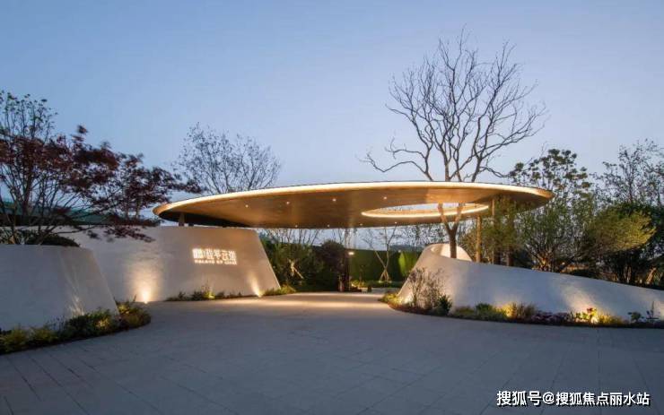 景观门头的设计语言采用新颖的曲线倒圆角的形式,做到了与售楼处风格的完美统一融合。和平云璟是一个便利于各个人生阶段的居民的生长型社区,设计师将“生长”的寓意栽种于归家的礼仪庭院中间。圆弧的树池象征着生命如四季一般轮回接替,家族树象征着家族的繁荣兴盛、开枝散叶。在一侧的墙体间做镂空的处理,可以透过格栅看到对面的郁郁葱葱的雨水花园。