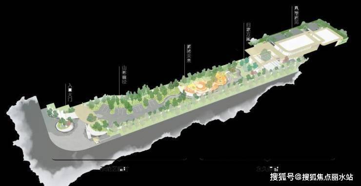 场地空间形态狭长,宽窄均一。项目通过调节绿植、地形、矮墙、色彩、铺装等变量将场地划分为五种富于变化且过渡自然的空间, 在参观流线上给予客户丰富的体验。