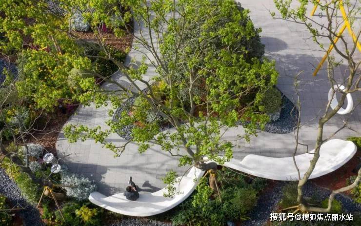 姿态婀娜的乌桕林下,斑驳的树影投射在地面和八角金盘上。当夕阳西下,丛间球形灯闪起点点暖光,伴随周围响起的舒缓的音乐,这里便成了林间的浪漫舞台。如果此时听到一两声鸟鸣,抬起头看来,会在余晖和枝杈掩映之间看到一两个鸟窝。这一隅清爽的空间,象征着山林与自然。