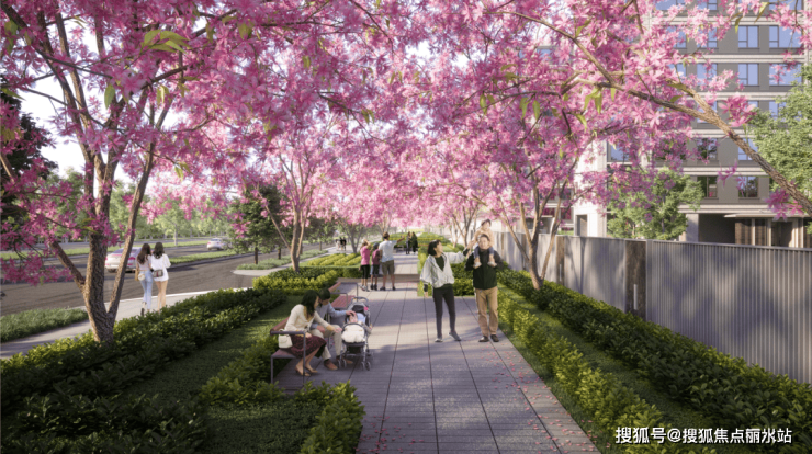 ·围绕外侧乐荟街,在市政绿化基础上进行进阶迭代,通过层级错落的绿化丰富转角景观,种植百棵樱花树打造绿色优质生态步道围合小区,伴随阵阵微风,打造金华都会下的活力森居生活。